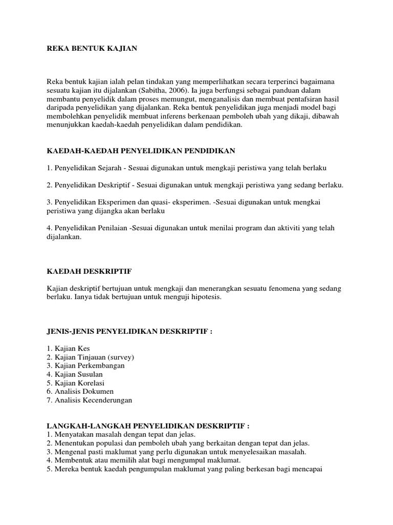 33 Tajuk - Alat Ukur Apakah itu alat ukur atau in. Reka bentuk kajian ialah pelan tindakan yang memperlihatkan secara terperinci bagaimana sesuatu kajian itu dijalankan Sabitha 2006. Nampak macam hebat tapi kalau gagal dijalankan dengan baik sampel frame mengarut-ngarut data tah hape-hape teori tak mantap tak cukup instrument.